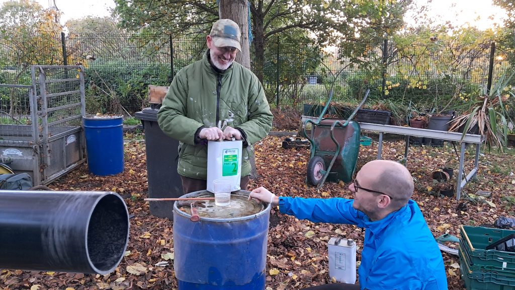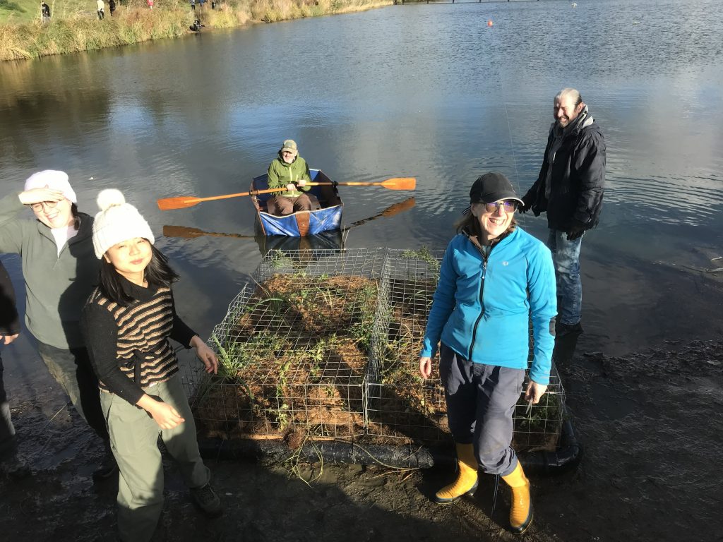 In November 2025 one of the small islands was returned to the lake. The new buoyancy is the foam filled pipes around the island, replaced coir mat and new plants. The plants will dieback in the winter but regrow in the spring, protected by the wire cages.
