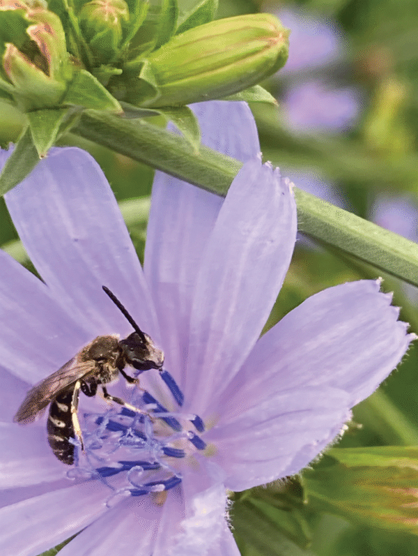 This is one of the ‘Sweat bees’ so if they land on you, they’re after the salt in your sweat. They dig tunnels underground where they lay their eggs and store a supply of pollen. They are solitary bees, but many bees may choose the same location for their nest.